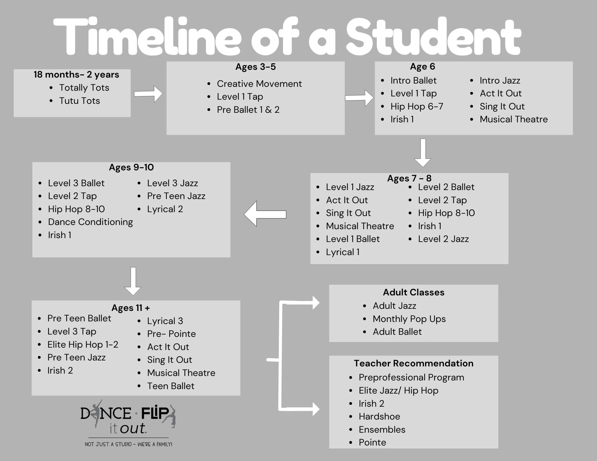 Regular attendance is essential for a student’s progress and development. Consistency helps students build on the skills they are learning week by week, ensuring they don’t fall behind. It also promotes discipline, strengthens technique, and fosters a sense of commitment. Regular attendance allows students to stay on track with choreography, class goals, and overall growth in their dance or gymnastics journey.