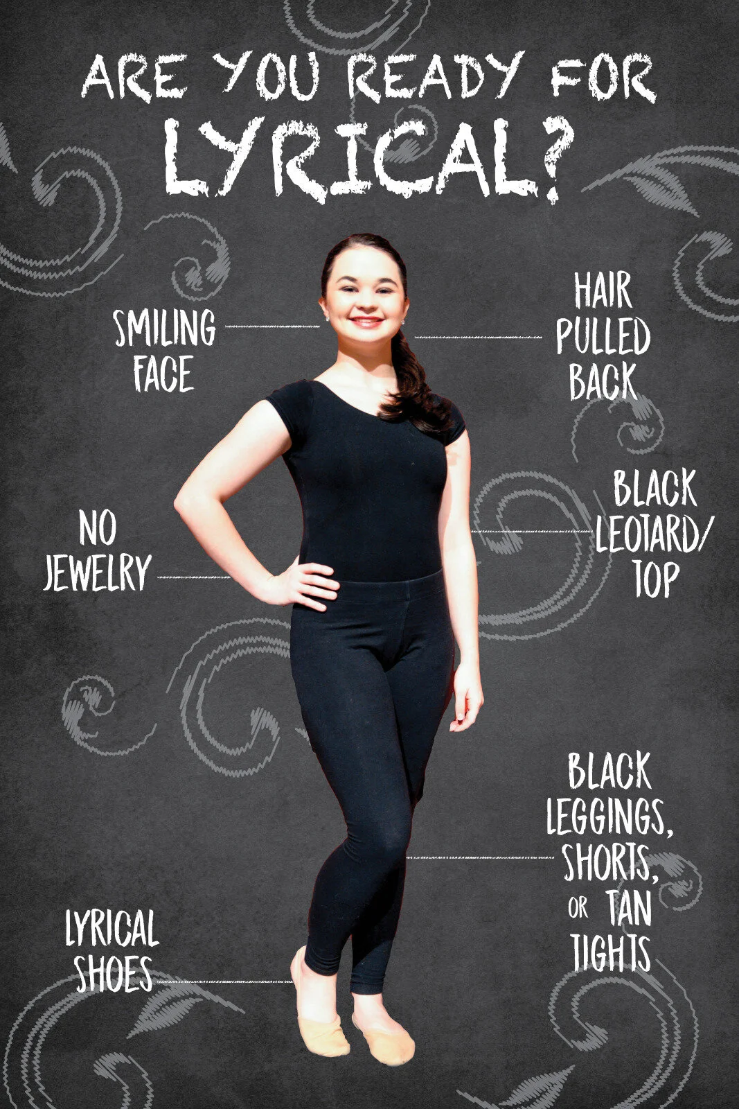 Boys – Boys are expected to wear black shorts or pants, white tank top, or short sleeve shirt. Lyrical shoes or Foot-Undeez are required.
